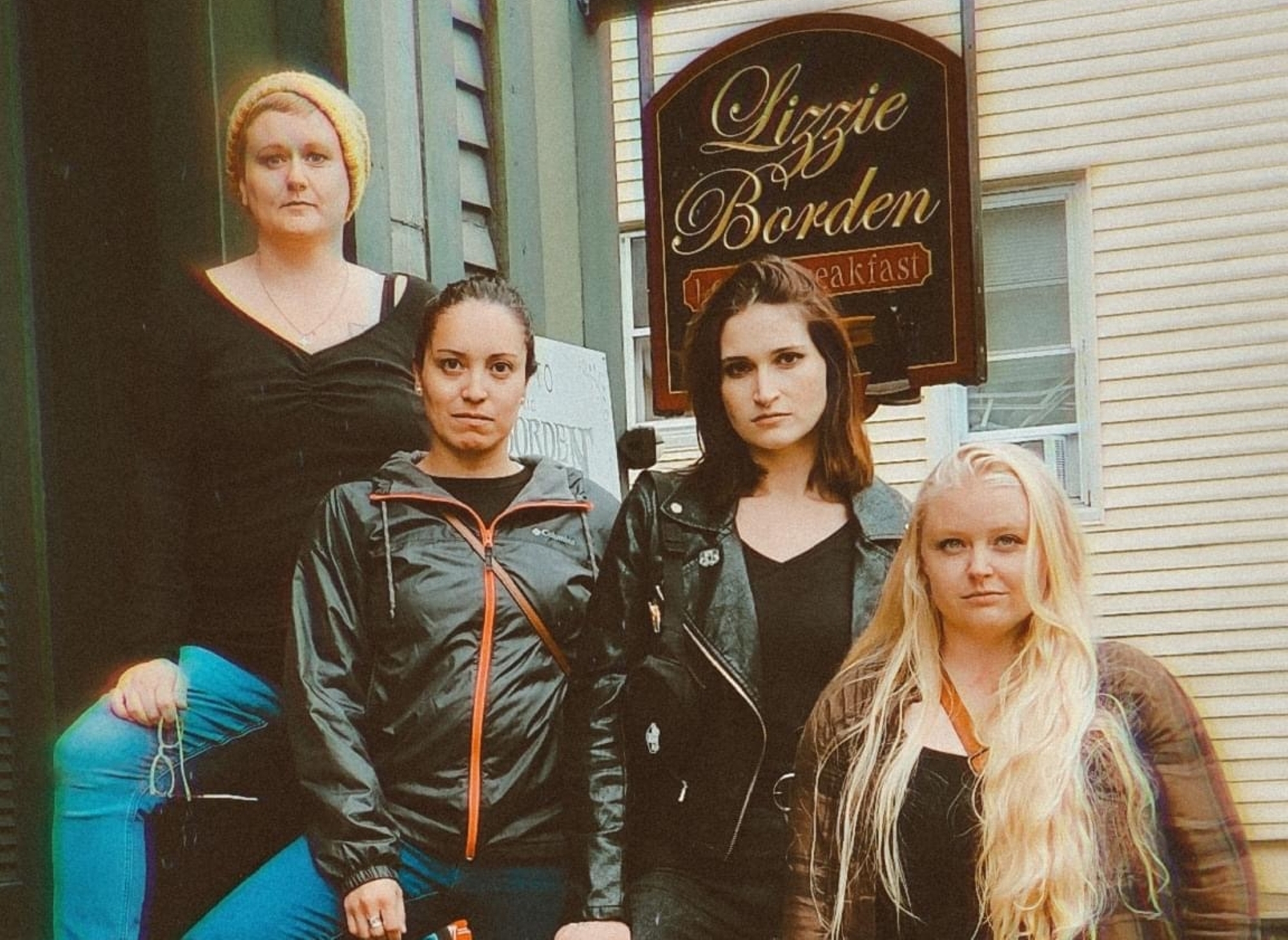 From L to R: Cici Cadeaux (Bridget), Tina Sparkle (Alice), Kerrie Maguire (Emma), Shealyn Berube (Lizzie) at the Lizzie Borden House.